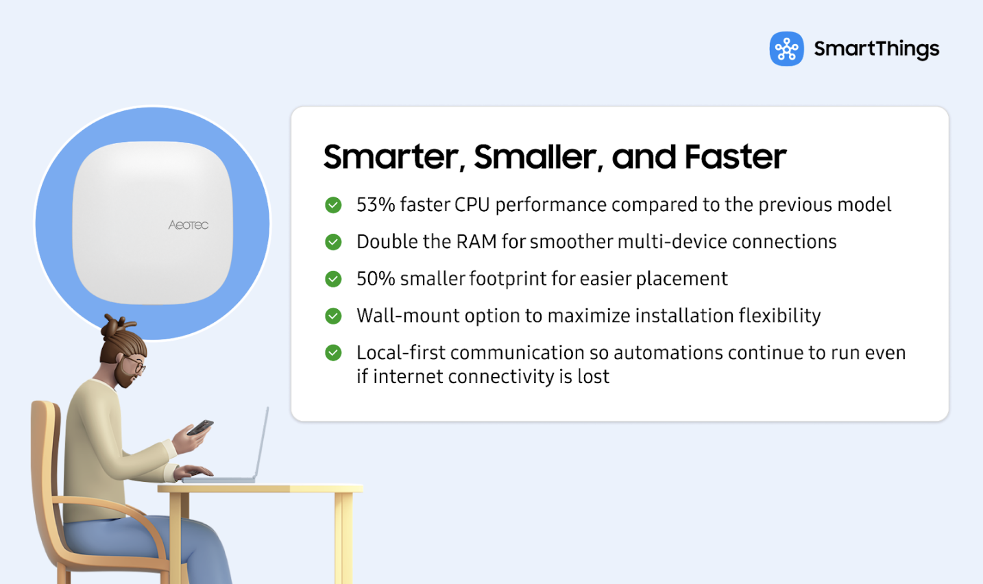 Smaller, faster, and more versatile, the new Samsung SmartThings hub strengthens connectivity for the world’s most advanced smart home ecosystem.