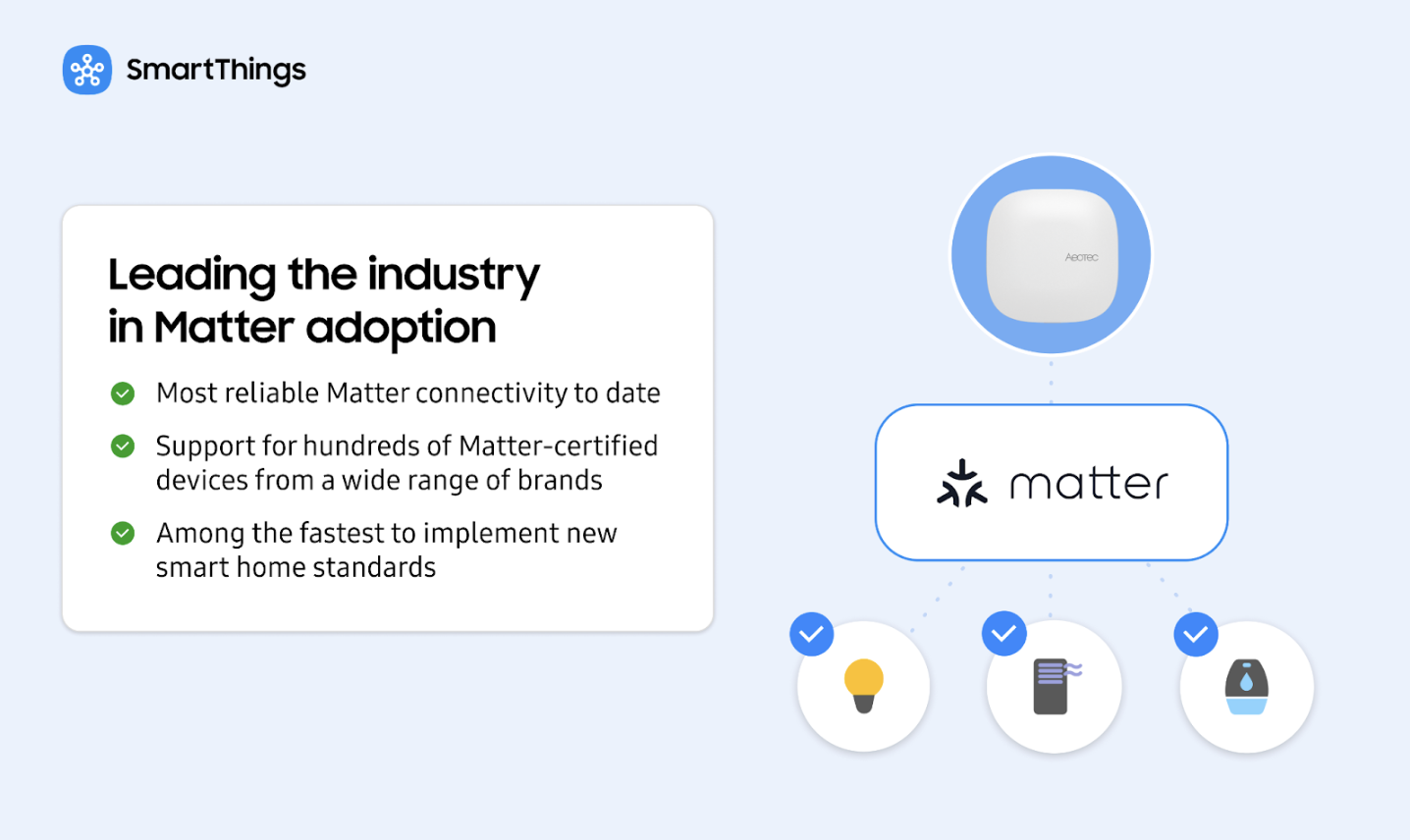 SmartThings has not only been a leader in developing Matter, but was the first ecosystem to support Matter, has been among the fastest to implement new Matter versions, and has publicly committed to timely device support and feature updates. The Smart Home Hub 2 delivers the best experience for users looking to start and grow their smart home with Matter, with support for hundreds of Matter-certified devices from a wide range of brands, including Matter-over-Thread products via its integrated Thread Border Router.